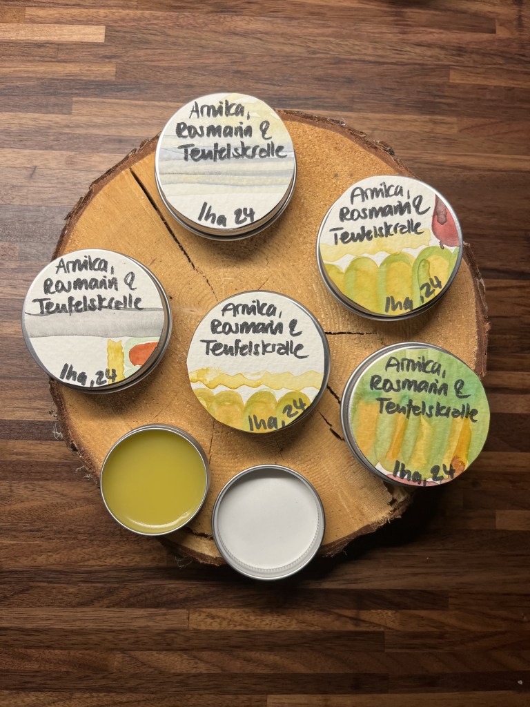 Zusatzstoffe: ausser dem reinen Pflanzenwirkstoff benutze ich hochwertige Öle wie Mandelöl, Jojobaöl, Bio Rapsöl oder Bio Olivenöl. Um die Salbe zu festigen benutze ich Bio Bienenwachs.