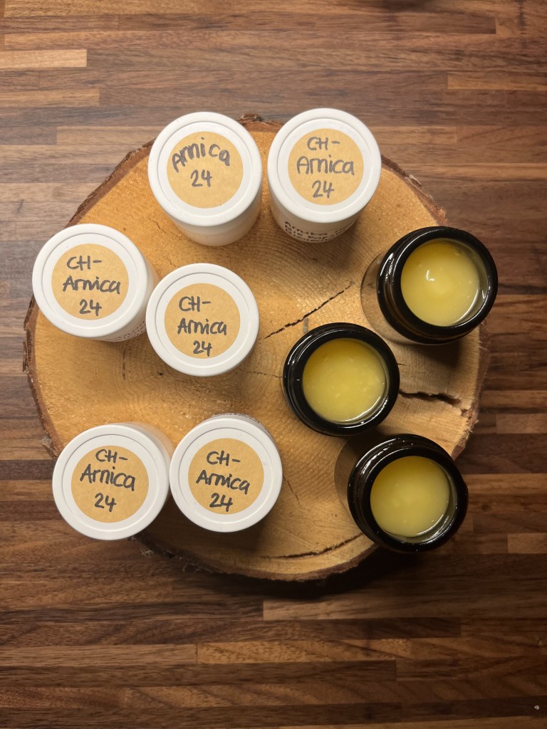 Arnika: wirkt entzündungshemmend, gegen Blutergüsse, Verstauchungen und Zerrungen. Nur äusserlich anwenden. Bei stumpfer, akuter Verletzung bis zu 6 mal am Tag, danach 2-3 mal am Tag sanft einreiben.